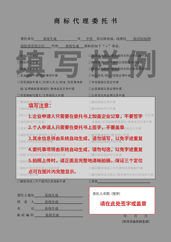 注:委托书已经自动生成。请下载并打印,以自然人名义申请的需黑笔签名,以企业名义申请的需盖公章后,扫描彩色件并上传;要求图片为jpg格式。